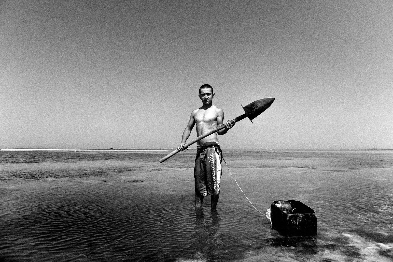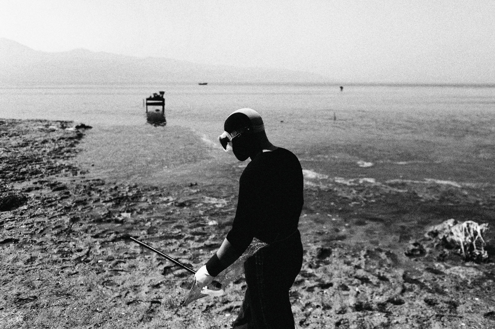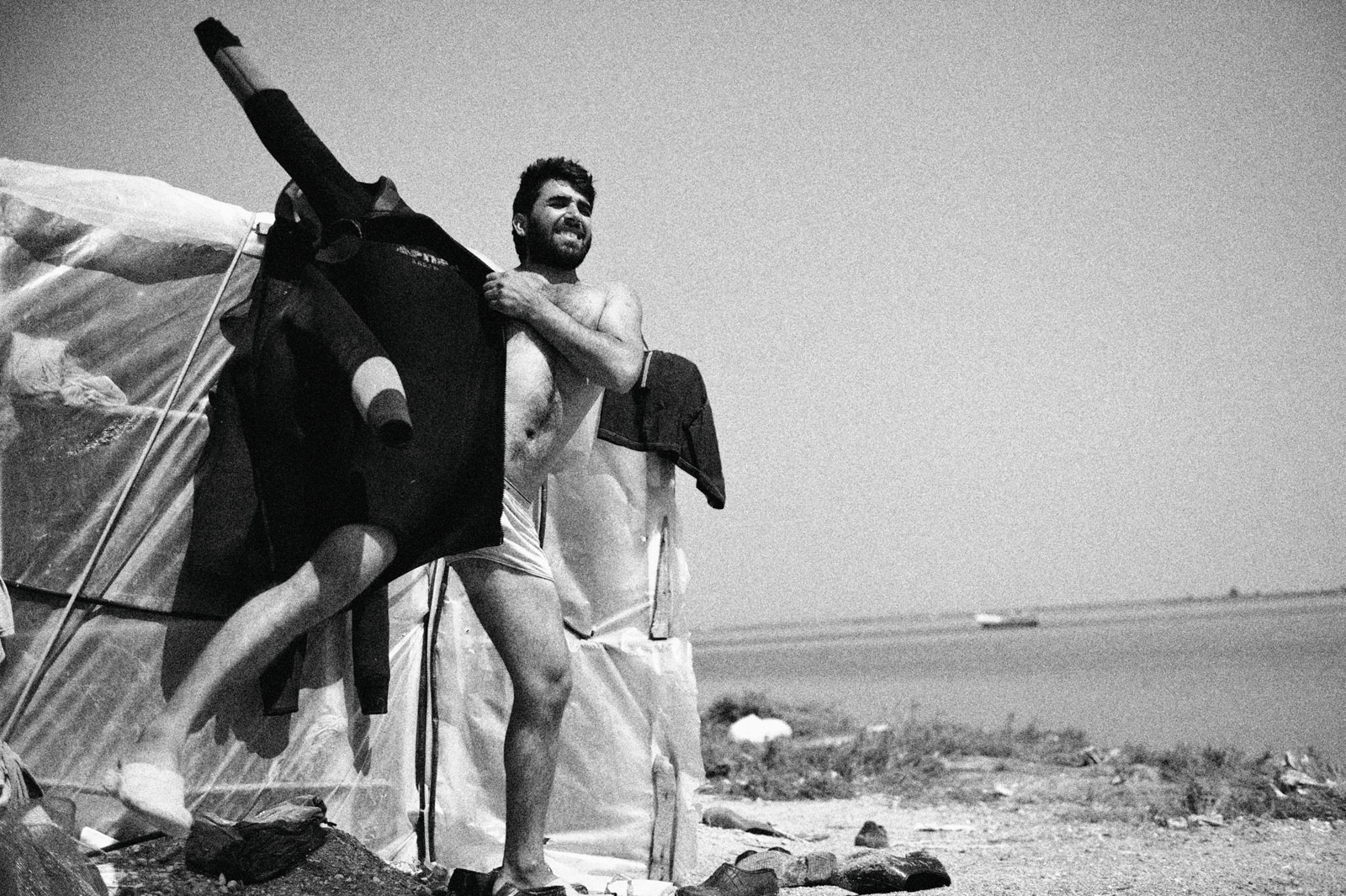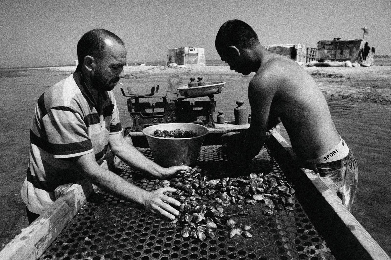Aquadis is the name given to a type of mussel. This type of mussel is white in color and is frequently consumed in Mediterranean cuisine.The Aquadis collected in the shallow areas of the Gulf of Izmir are sent abroad based on the informal economy. The workers, who are frequently raided by the authorities, earn their living on a daily wage basis.Most Kurdish workers learn to swim and dive here. Young workers even go through a three-month training period on a small island when they come from their homeland.They live in huts and tents they have built themselves and spend nine months of the year in these living spaces.Among the male workers who return to their families with the start of the summer months, there are those who have been doing this job for forty years.This photo-interview work was done collectively with photographer Sinan Kılıç between 2013 and 2014.