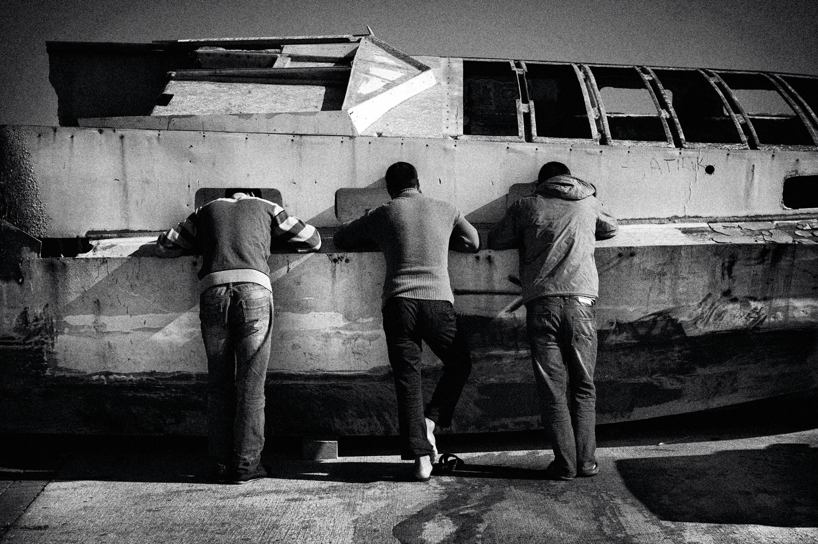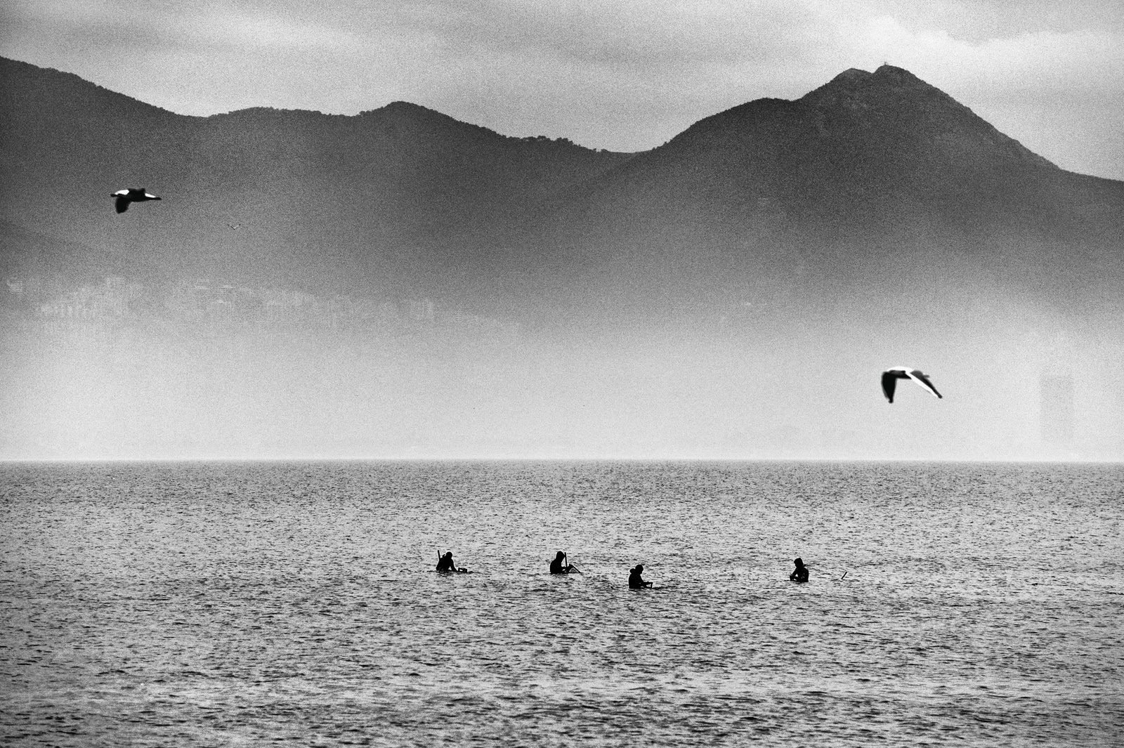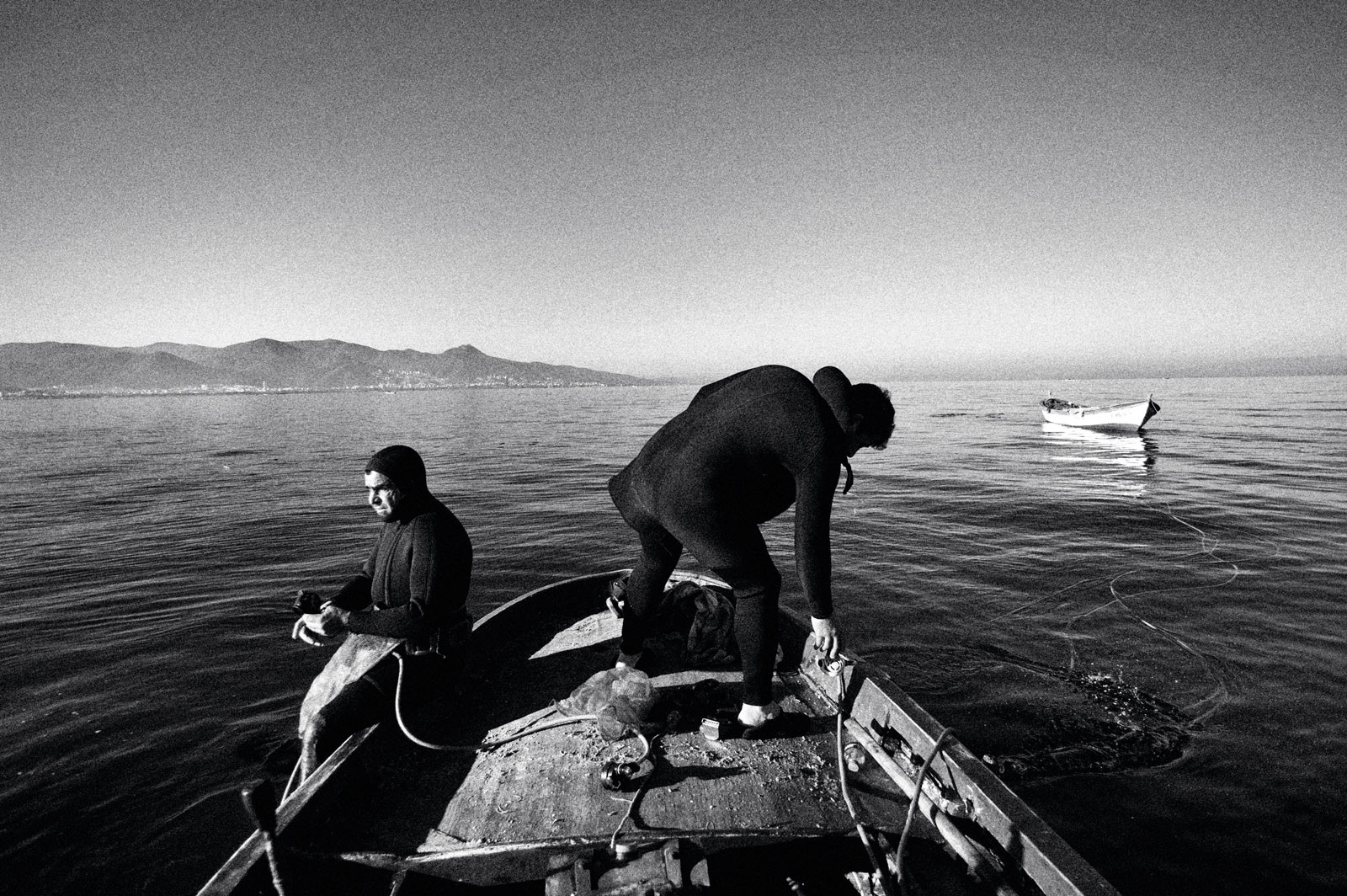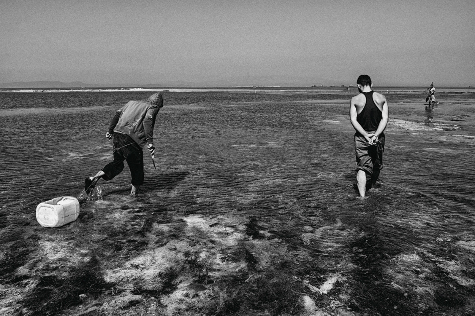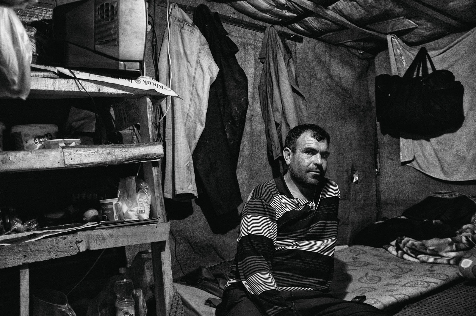 Aquadis is the name given to a type of mussel. This type of mussel is white in color and is frequently consumed in Mediterranean cuisine.The Aquadis collected in the shallow areas of the Gulf of Izmir are sent abroad based on the informal economy. The workers, who are frequently raided by the authorities, earn their living on a daily wage basis.Most Kurdish workers learn to swim and dive here. Young workers even go through a three-month training period on a small island when they come from their homeland.They live in huts and tents they have built themselves and spend nine months of the year in these living spaces.Among the male workers who return to their families with the start of the summer months, there are those who have been doing this job for forty years.This photo-interview work was done collectively with photographer Sinan Kılıç between 2013 and 2014.