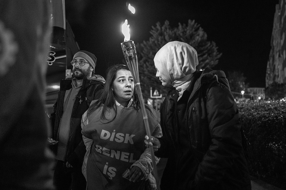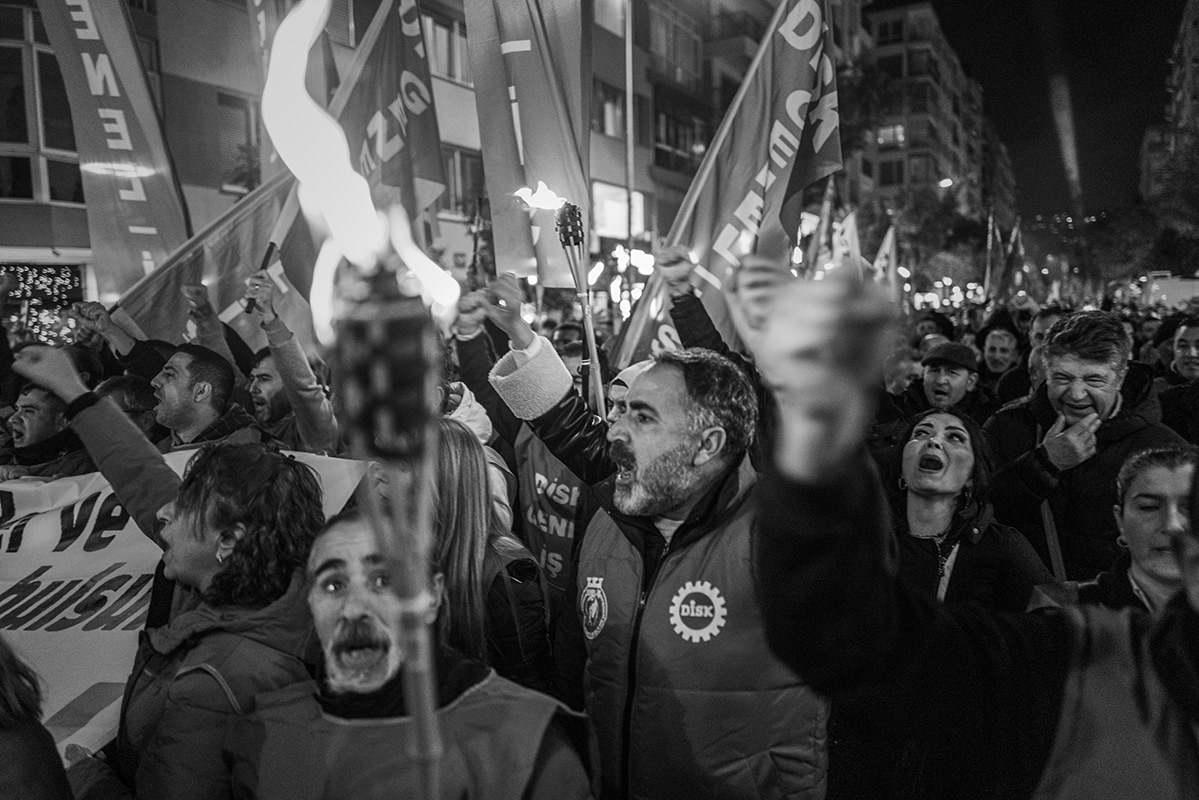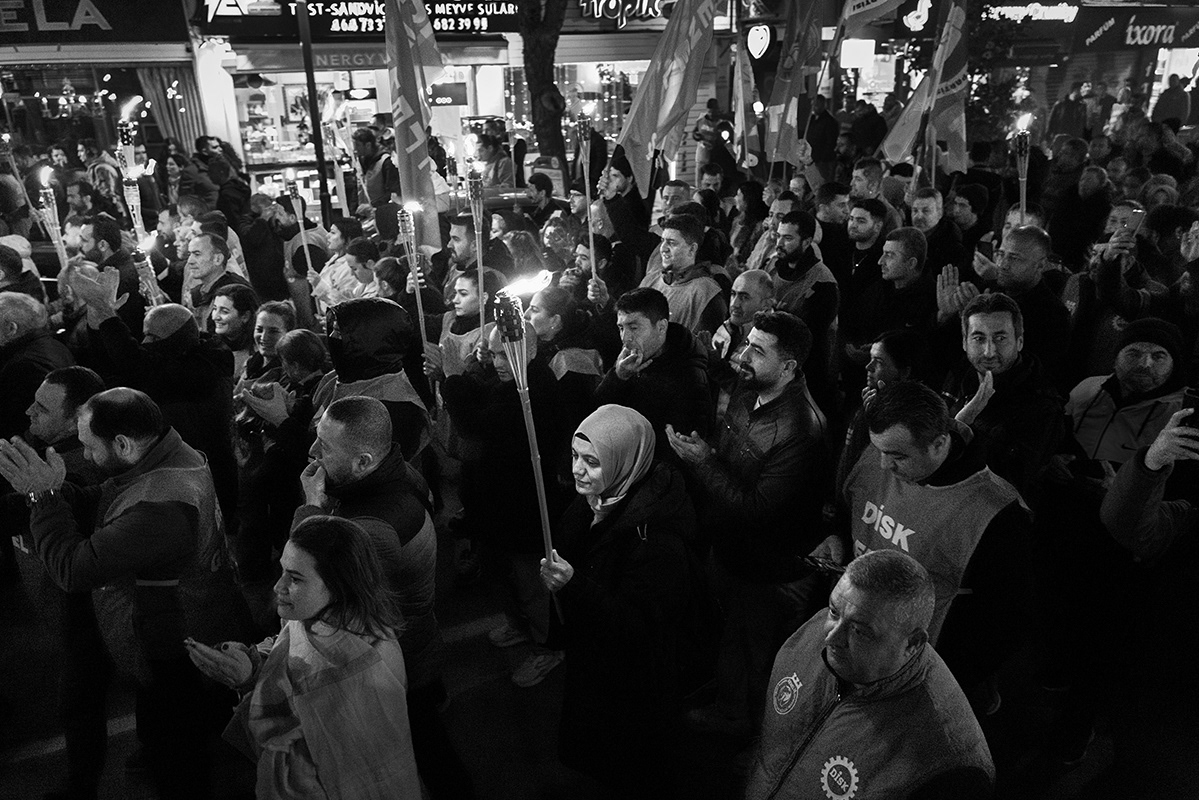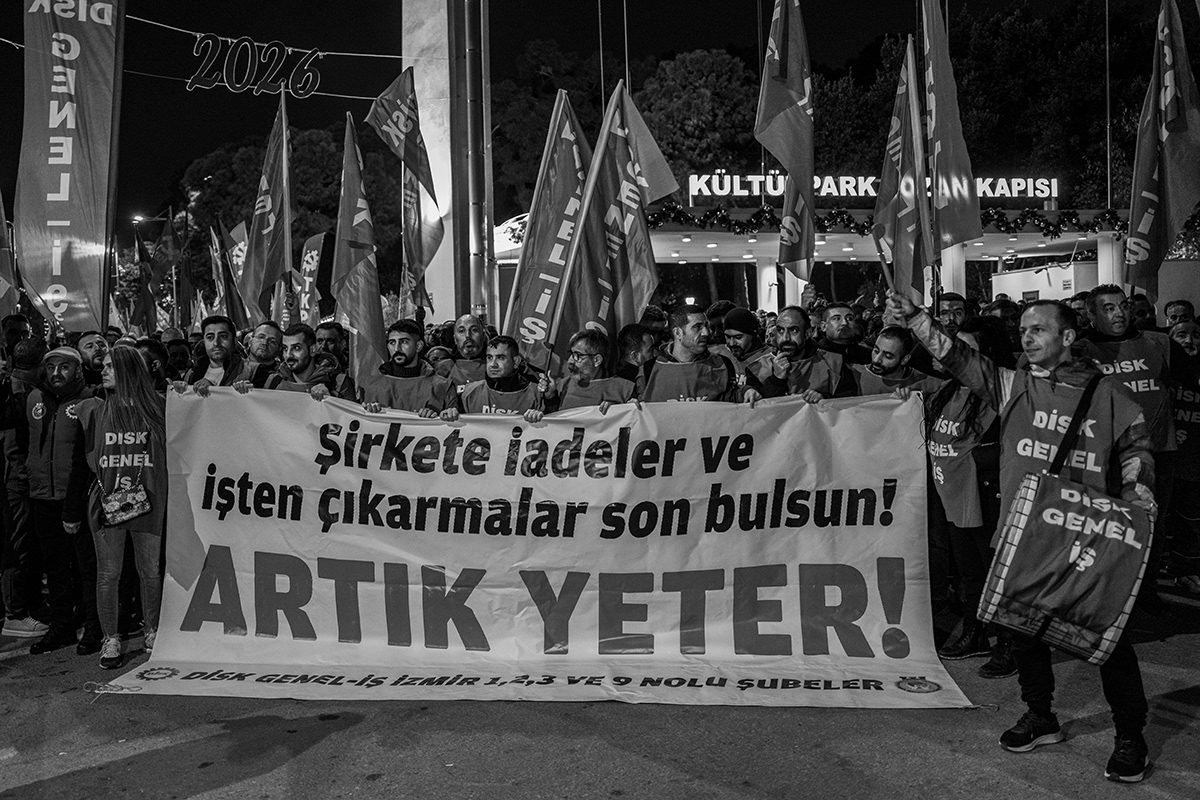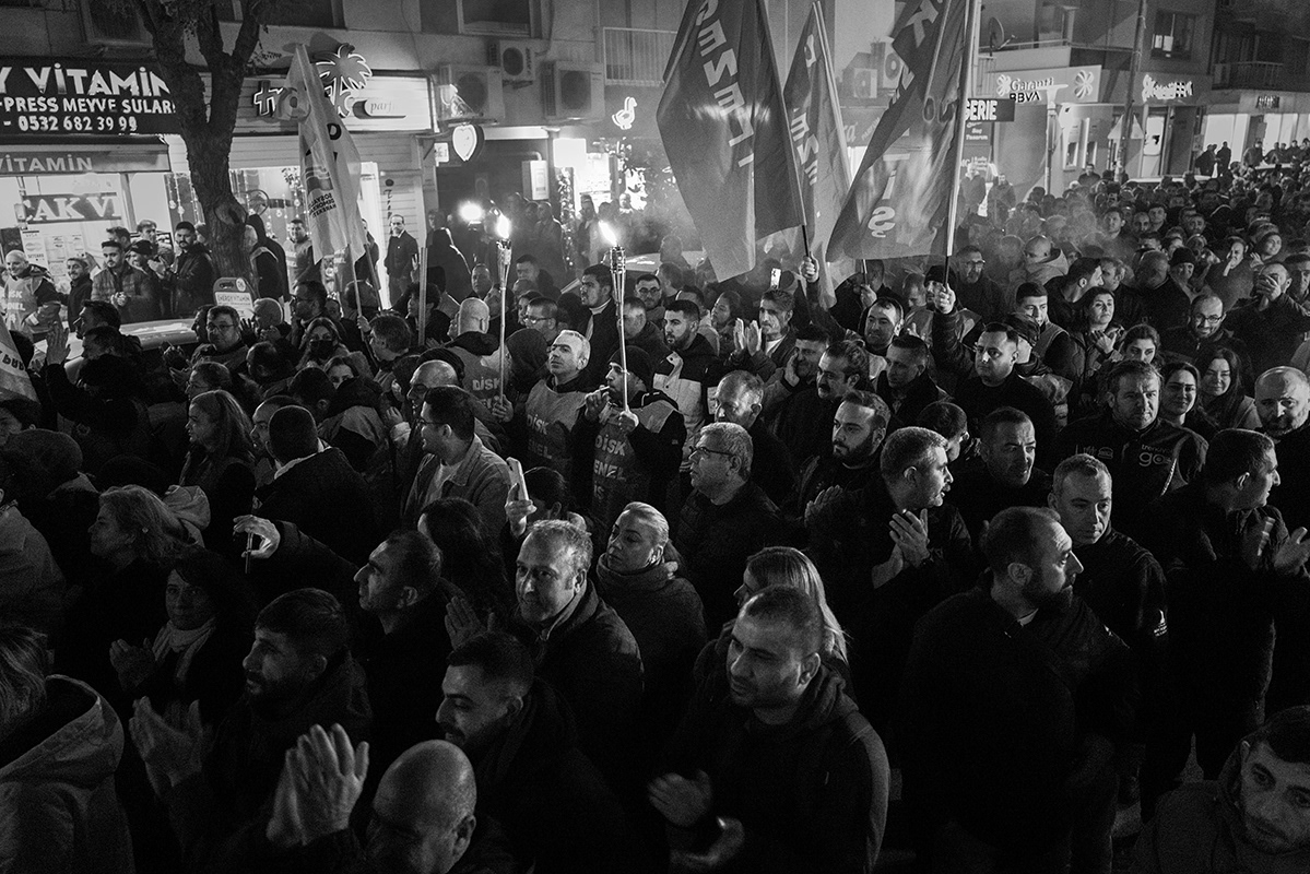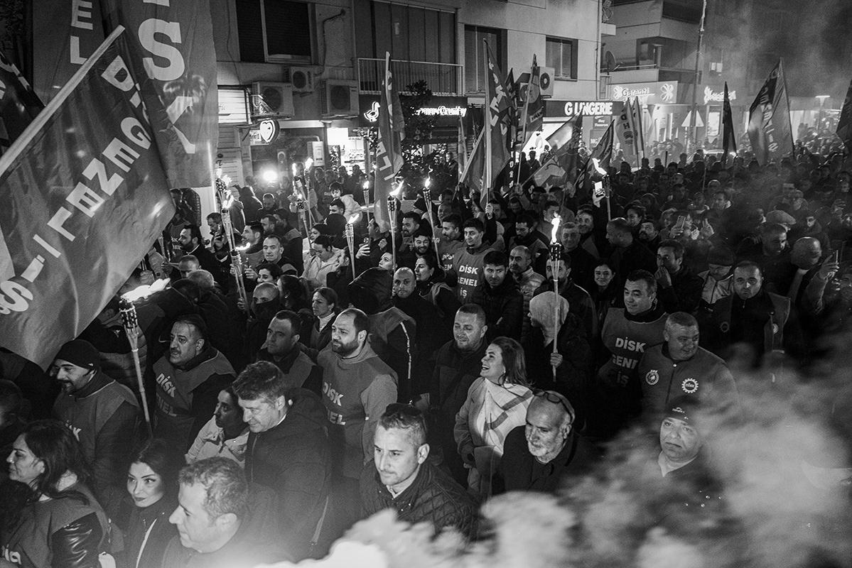 Employees of various Izmir Metropolitan Municipality subsidiaries organised a protest, including a torchlight march, to express their dissatisfaction with the late payment of their November salaries and the failure to pay additional social benefits for four months. The workers gathered in front of Lozan Square in Izmir and began their march. 9 December 2025, Izmir, Turkey. The municipality is governed by the main opposition party, the Republican People's Party (CHP), and is the third largest city in Turkey.